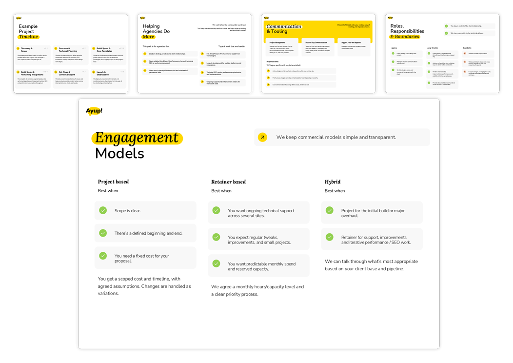 You do the client relationships, strategy and creative. We take care of the build, technical SEO and performance – under your brand. Our white label team slots into your existing process, gives you predictable delivery capacity and keeps your clients close to you, not us.